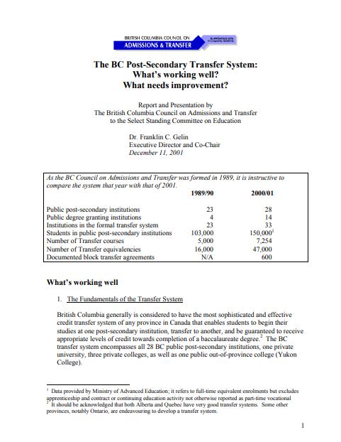 BC’s Post-Secondary Transfer System: What’s Working Well? What Needs Improvement?This report reviews the state of the BC Transfer System (2001).