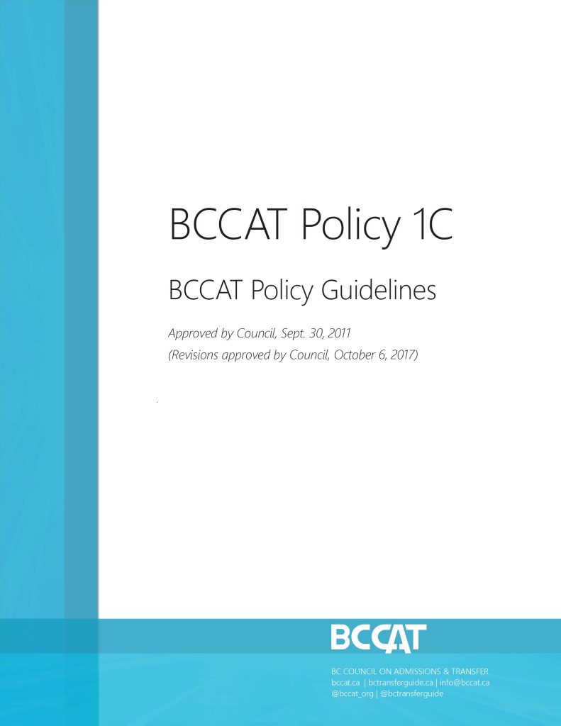 Policy 1C: BCCAT Policy Guidelines outline the processes Council follows in developing and revising policies relating to membership in the BC Transfer System and the use of BCCAT services and resources.